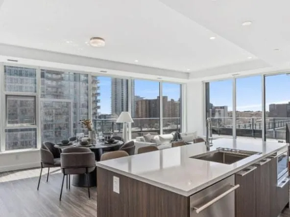 Sleek, open-concept layout with city skyline views and floor-to-ceiling windows. Perfect for professionals who value comfort, design, and convenience just minutes from transit, dining, and entertainment.